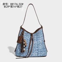 Women's Retro-style Brown Fringed Beaded Woven Denim Tote Bag Large Capacity Shopping Shoulder Bag Single Polyester Fashion